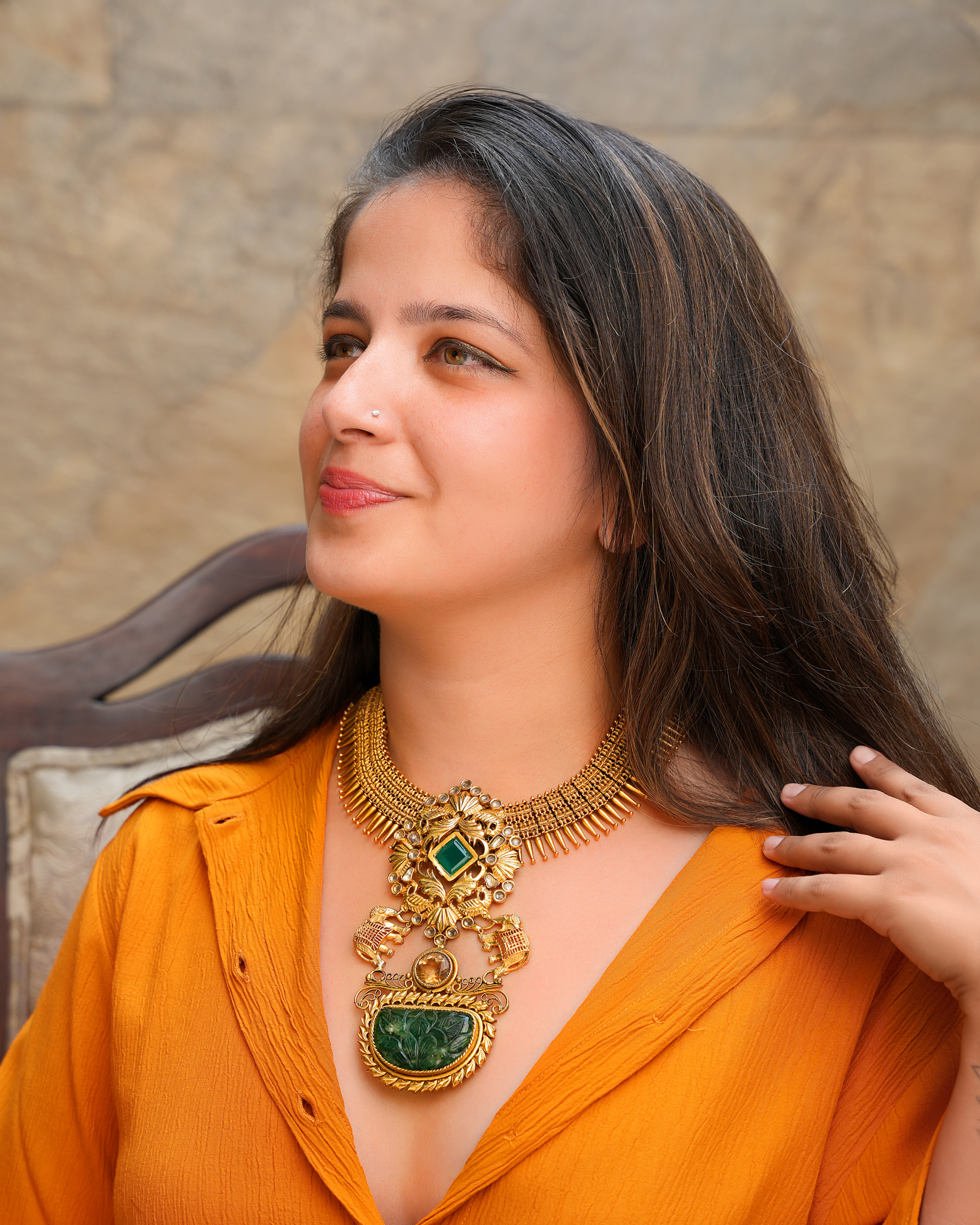 Imperial Mulla Mottu Hasli – Hand-Carved Jade & Navrattan-Style Statement Necklace with Rearing Horse Nakashi